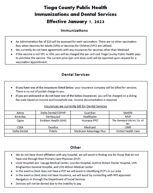 Tioga County Public Health’s mission is to protect and promote the health and well-being of our community through advocacy, education, enforcement, prevention and partnerships. In striving to provide the Ten Essential Services of Public Health, we aim to serve as the public health leader to ensure the needs of our community are met through an integrated and coordinated network of resources that empower people to improve their quality of life. Tioga County Public Health supports the citizens of the County through Environmental Health, Dental Health, Disease Control, Nursing Services, Children's Services, Emergency Preparedness and Health Education programs.